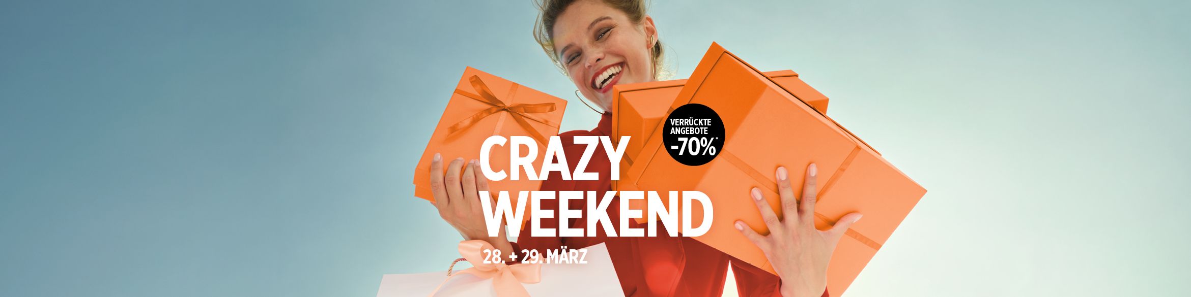 Freuen Sie sich auf das Crazy Weekend am 28. + 29. März. Zahlreiche Angebote von über 40 Home, Fashion & Lifestyle Marken warten zu verrückten Preisen auf Sie! Finden Sie schon jetzt Ihr neues Lieblingsstück zu unschlagbaren Preisen und planen Sie Ihren Besuch in das City Outlet Geislingen. Wir freuen uns auf Ihren Besuch!