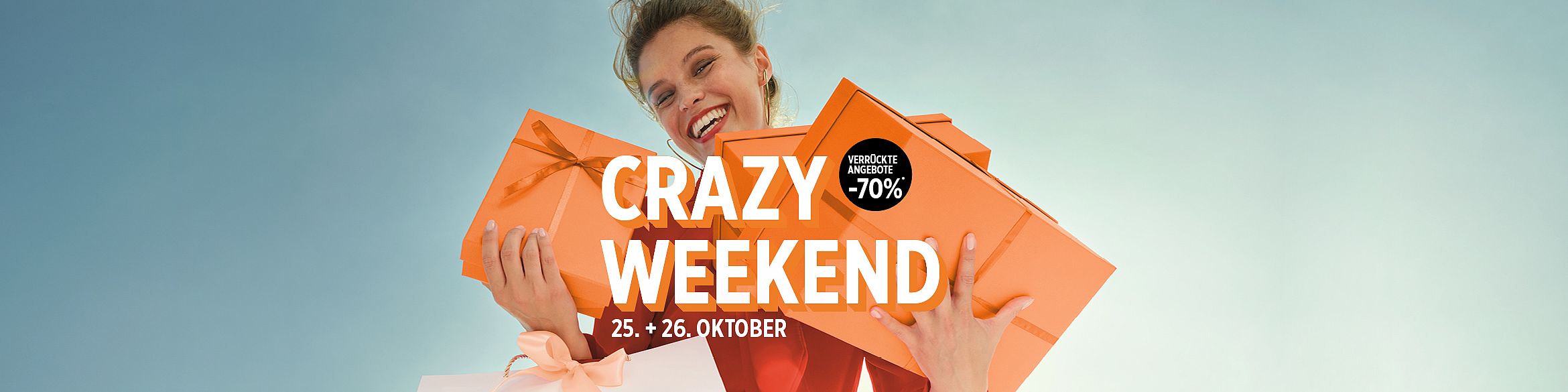 Freuen Sie sich auf das Crazy Weekend am 25. + 26. Oktober. Zahlreiche Angebote von über 40 Home, Fashion & Lifestyle Marken warten zu verrückten Preisen auf Sie! Finden Sie schon jetzt Ihr neues Lieblingsstück zu unschlagbaren Preisen und planen Sie Ihren Besuch in das City Outlet Geislingen. Wir freuen uns auf Ihren Besuch!