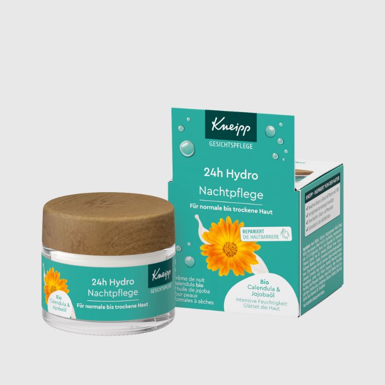 Die Kneipp 24h Hydro Nachtpflege für normale bis trockene Haut spendet intensive, langanhaltende Feuchtigkeit. Sie glättet die Haut und stimuliert die hauteigene Regeneration der Hautbarriere, um Hautalterungsprozessen entgegen zu wirken. Die reichhaltige Gesichtspflege mit anti-oxidativem Bio Calendula-Extrakt sowie pflegendem Jojobaöl, Sheabutter und hautberuhigendem Panthenol regeneriert die Haut über Nacht und hinterlässt ein weiches Hautgefühl.