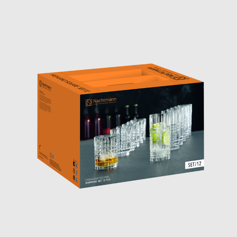 Je 6 x Whiskybecher und Longdrinkbecher HIGHLAND SQUARE im Geschenkkarton mit Tragegriff