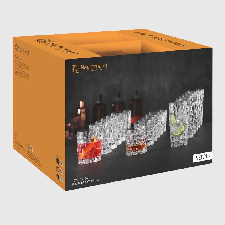 Je 6 x Whiskybecher, SOF und Longdrinkbecher BOSSA NOVA im Geschenkkarton mit Tragegriff