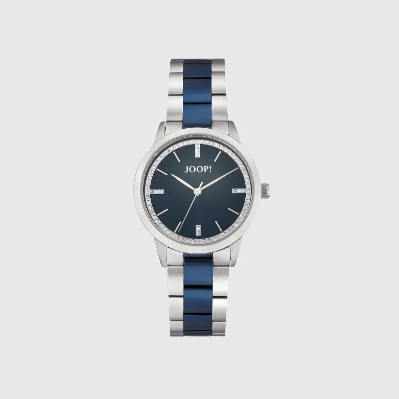 Edelstahl Uhr mit blauem Ziffernblatt und Zirkonia Steinen