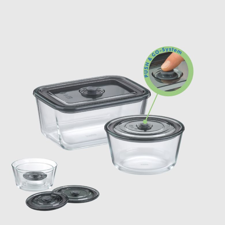 Seal & fresh System, gefriergeeignet, spülmaschinengeeignet, durch Luftabsaugknopf im Deckel sehr gute Dichtigkeit & Frischhaltefunktion, mikrowellengeeignet 800 Watt 3min, Glas 300°C beständig