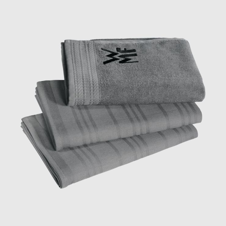 Gläser, Bestecke oder Kochgeschirr absolut fusselfrei trocknen, wie das 3-teilige Küchentuch-Set von WMF. Gefertigt aus 100 Prozent, schadstoffgeprüfter und besonders saugfähiger Baumwolle, besteht das Set aus einem Handtuch und zwei Geschirrtüchern.