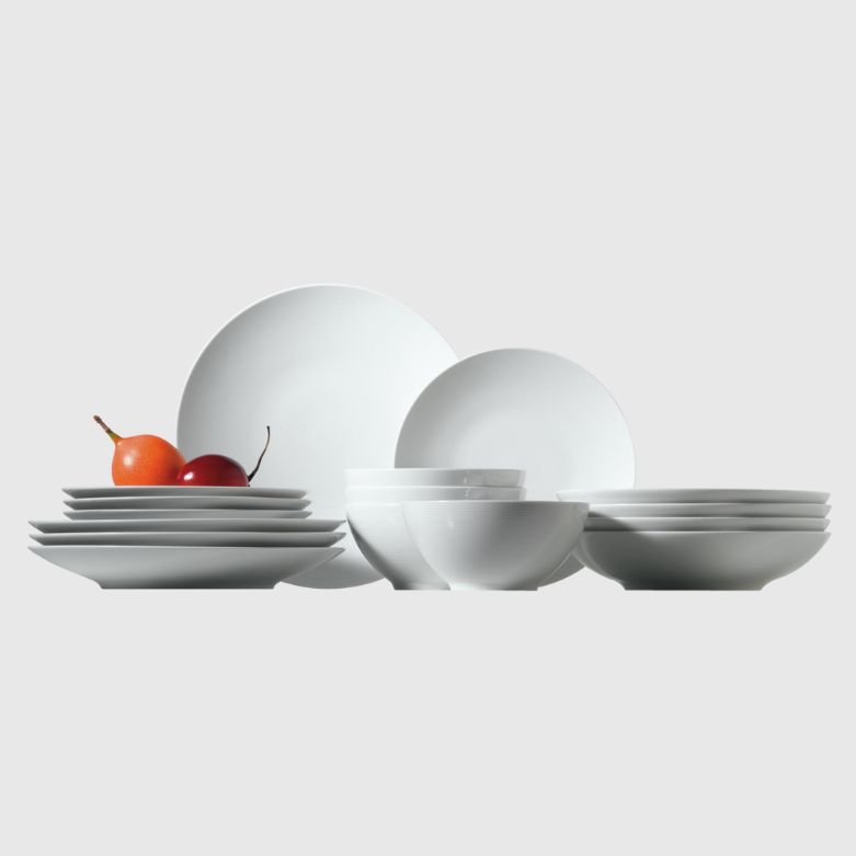 Loft Frühstück-Set mit Müslischale, für 4 Personen, Porzellan weiß, bestehend aus: 4x Speiseteller 28cm, 4x Suppenteller, 24cm, 4x Frühstückssteller 24cm, 4x Müslischale