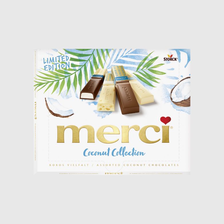 4 verschiedene gefüllte und nicht gefüllte merci Kokos SchokoladenSpezialitäten