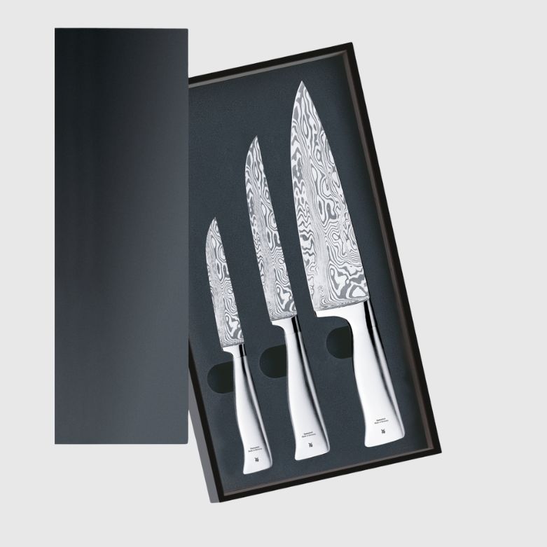 Damasteel® ist ein unvergleichlicher Klingenstahl höchster Reinheit, der mittels eines pulvermetallurgischen Verfahrens hergestellt wird. Wie beim Damaszenerstahl werden dazu hochwertige Stähle verschiedener Härten verwendet. Diese werden pulverisiert und unter Vakuum mit extremem Druck zu einem etwa 120-lagigem Klingenstahl verbunden - für WMF Messer mit einzigartiger Zähigkeit und Festigkeit sowie überlegener Kantenschärfe und Schneidfähigkeit.