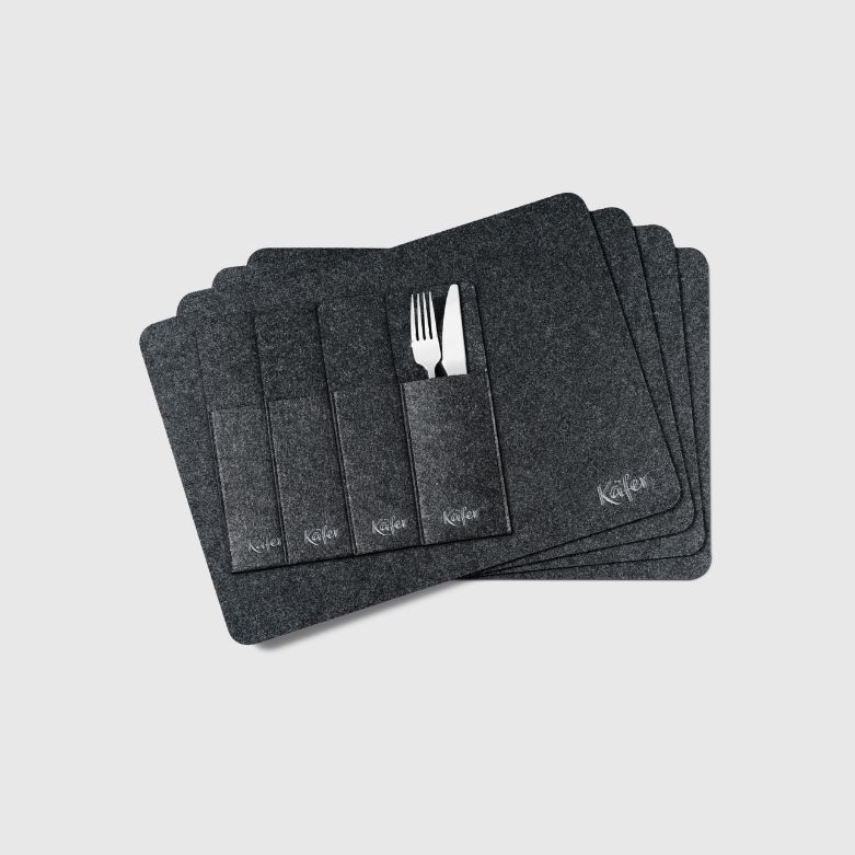 Hochwertiges Platz-Set für 4 Personen, bestehend aus: 4x Platzdecken 4x Bestecktaschen 4x Untersetzer Filz-Optik in anthrazit Platzdecken und Untersetzer mit rutschfester Unterseite Maße: L 45 x B 32 cm