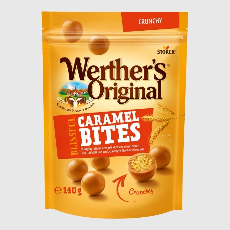 In den Sorten Crunchy oder Cookie, Karamell-Konfekt gefüllt mit Weizenvollkorn-Crisp oder gefüllt mit knusprigem SchokoladenGebäck.