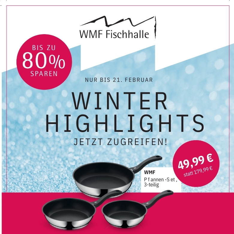Referenzpreis ist die UVP für A-Ware des Herstellers WMF BU Consumer GmbH bzw. der Groupe SEB WMF Consumer GmbH, beides Gesellschaften unseres Konzerns. Die Aktion gilt nur im WMF Fabrikverkauf (Fischhalle) im Zeitraum 12.02. – 21.02.2026 und nur solange der Vorrat reicht. Ware ist in so genannter 2A Qualität (Auslaufmodelle oder geprüfte Retouren). Produkte selbst und/oder die Verpackung können optische Abweichungen aufweisen. Alle Produkte sind voll funktionsfähig und entsprechen den relevanten Sicherheitsstandards. Produktabbildungen können abweichen. Änderungen und Irrtümer vorbehalten.